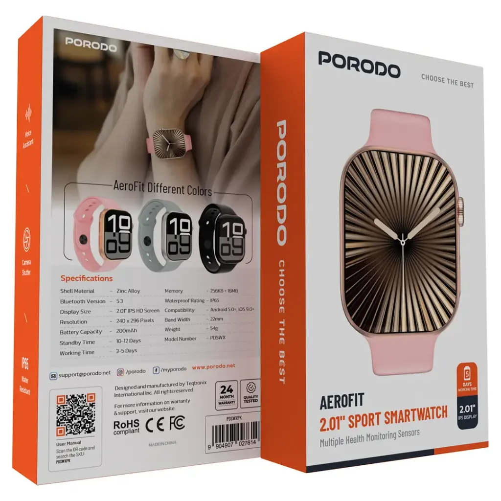 Porodo Aerofit 2.01" Sport Smartwatch features a 2.01" IPS HD display with a resolution of 240 × 296 pixels that is so bright and clear. Multiple health monitoring sensors track your movement every day, exercise, and vital signs-the perfect fitness companion