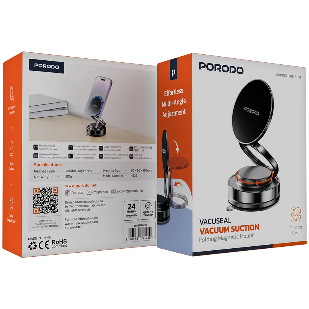 The Porodo Dual Mount MagSafe Phone Holder is committed to ease and stability, that is, if a user needs it in their car or on their desk. With a powerful N52 magnet, it keeps MagSafe-compatible devices securely in place with a magnetic hold, and if the road gets off-track, it'll be the last of locks. The adjustable viewing angle that it offers allows the user to set their phone in the highest-visibility position for navigation or video calls. This is a dual mount, including an air vent clip for inside vehicle installation and a base for mounting on various surfaces to offer movers placement options. Small but sturdy, it has a punch toward functionality and style. Whether on a daily commute or at home working, Porodo Dual Mount MagSafe Holder offers the hands-free ease and reliable support needed for every routine.